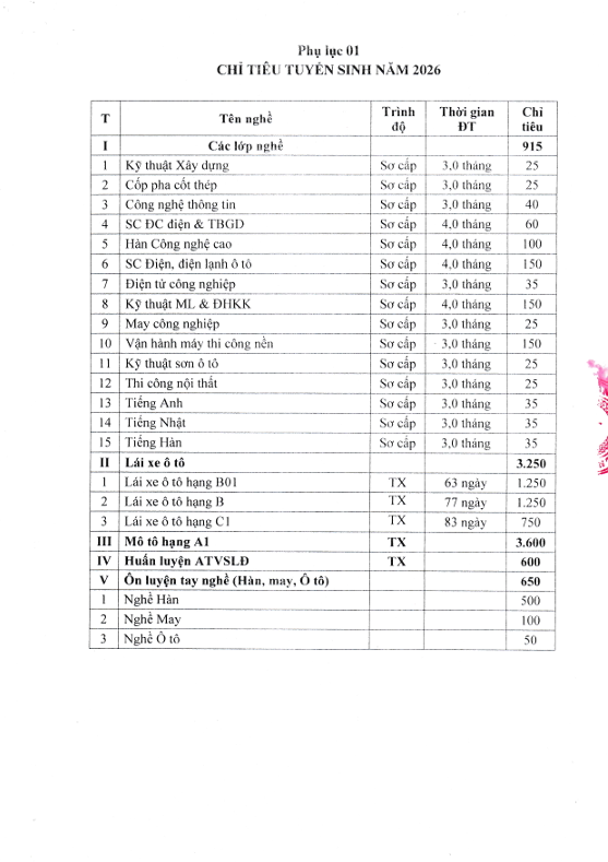 Ngành học --- Chọn ngành của bạn ---Lái xe hạng A1Lái xe hạng ALái xe hạng B (tự động)Lái xe hạng B (cơ khí)Lái xe hạng C1Kỹ thuật Xây dựngCốp pha cốt thépCông nghệ thông tinSửa chữ động cơ điện &TBGDĐiện tử công nghiệpKỹ thuật máy lạnh & ĐHKKHàn Công nghệ caoSC Điện, điện lạnh ô tôKỹ thuật sơn ô tôMay công nghiệpVận hành máy thi công nềnThi công nội thấtTiếng AnhTiếng NhậtTiếng Hàn